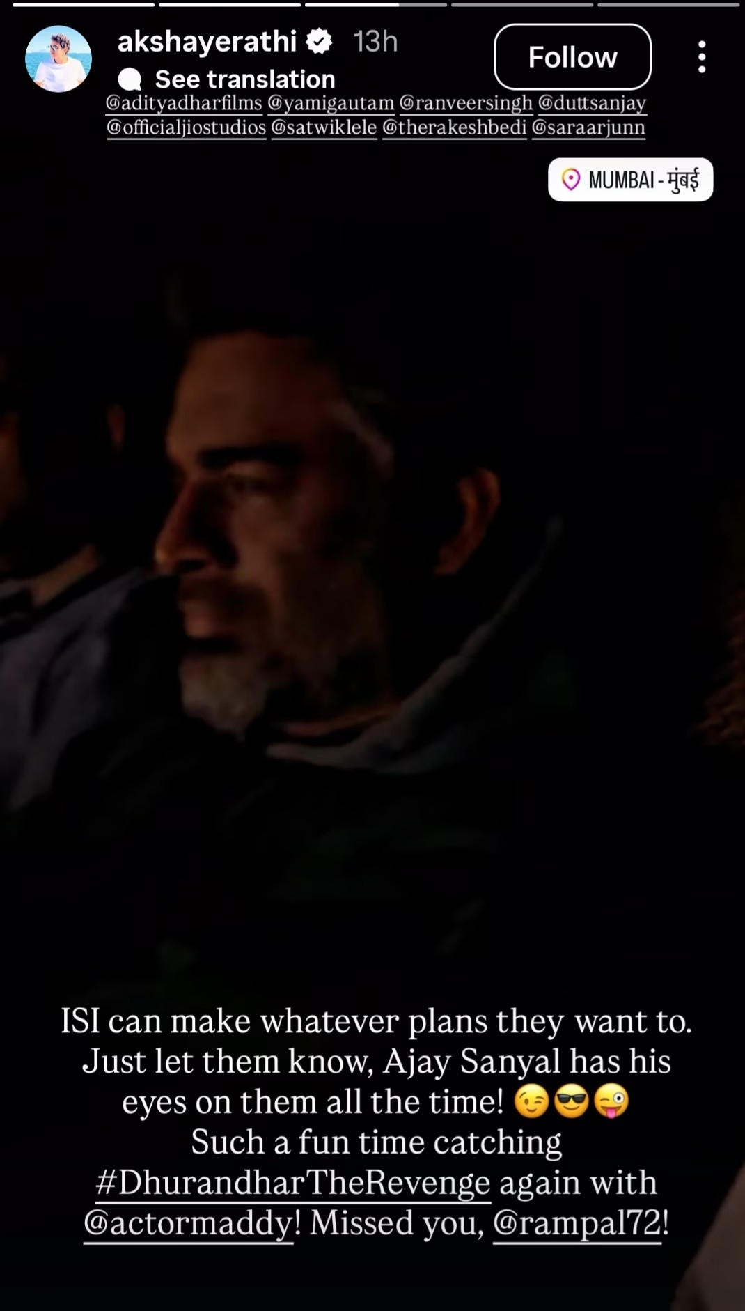 In the shared video online, R Madhavan was seen relaxed and watching the audienceâs reactions. Akkshay Rathie shared the moment on Instagram Stories, where he referred to the character played by R Madhavan in the film. Rathie captioned the moment with a reference to the actorâs on-screen role, writing that Ajay Sanyal âhas his eyes on them all the time,â adding that it was a fun experience watching the film together.