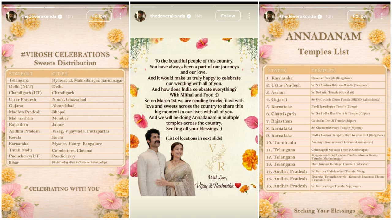 Both of them shared the details through their Instagram stories, which stated, "To all the beautiful people of this country. You have always been a part of our journeys and our love. And it would make us truly happy to celebrate our wedding with all of you. And how does India celebrate everything? With Mithai and food. So, on March 1st, we are sending trucks filled with love and sweets across the country to share this big moment in our lives with all of you. And we will be doing Annadanam in multiple temples across the country. Seeking all your blessings.”