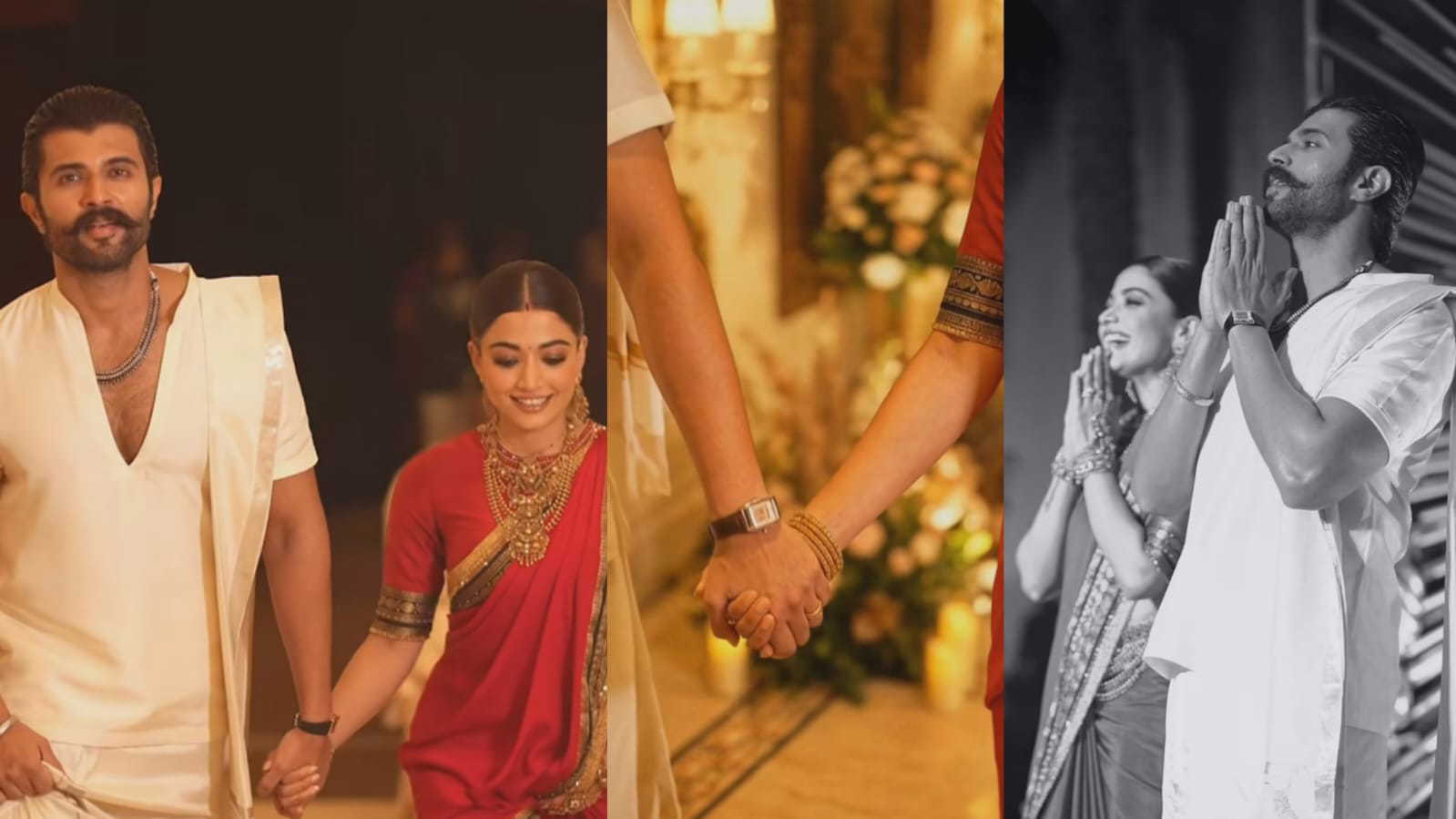 Rashmika Mandanna and Vijay Deverakonda walk hand-in-hand in the video, exchanging warm smiles. Their loving glances and constant eye contact show how deeply they are in love. Later, they make a grand entrance for the photographers, politely greeting them with folded hands.