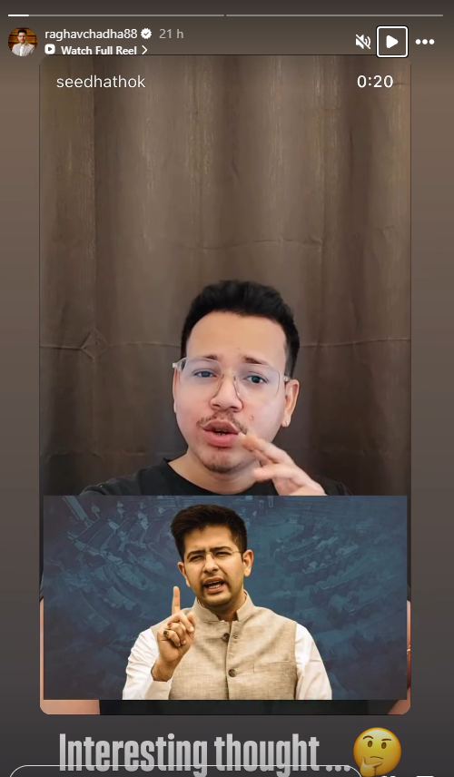 He shared a reel by a content creator, Rihan, who goes by the username âseedhathokâ, and described it as an âinteresting thoughtâ. The reel suggests that Chadha should chart his own course instead of aligning with any existing political outfit.