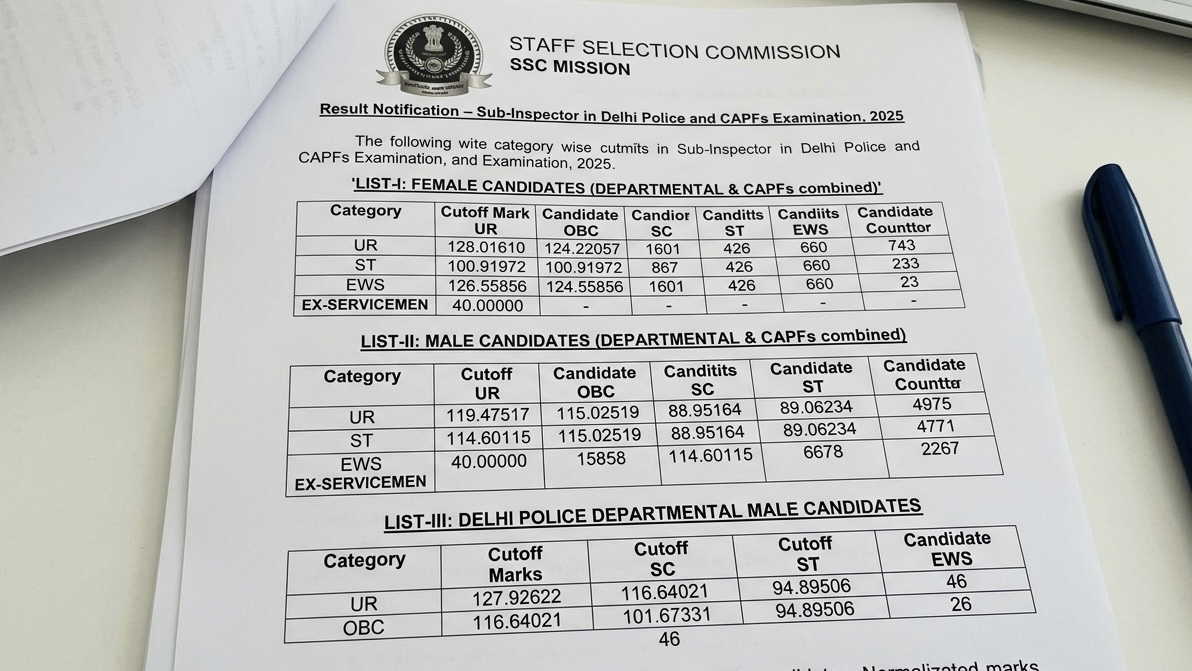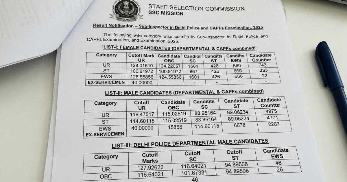 SSC has released the Paper-I results for the CPO 2025 recruitment drive. The exam was held between December 9 and 12, 2025, and was aimed at filling sub-inspector posts in Delhi Police as well as the Central Armed Police Forces (CAPFs). Marks have been normalized to prepare the final result list. Those who hold NCC certificates have been provisionally given bonus marks. However, these will only be confirmed once documents are verified at the next stage.