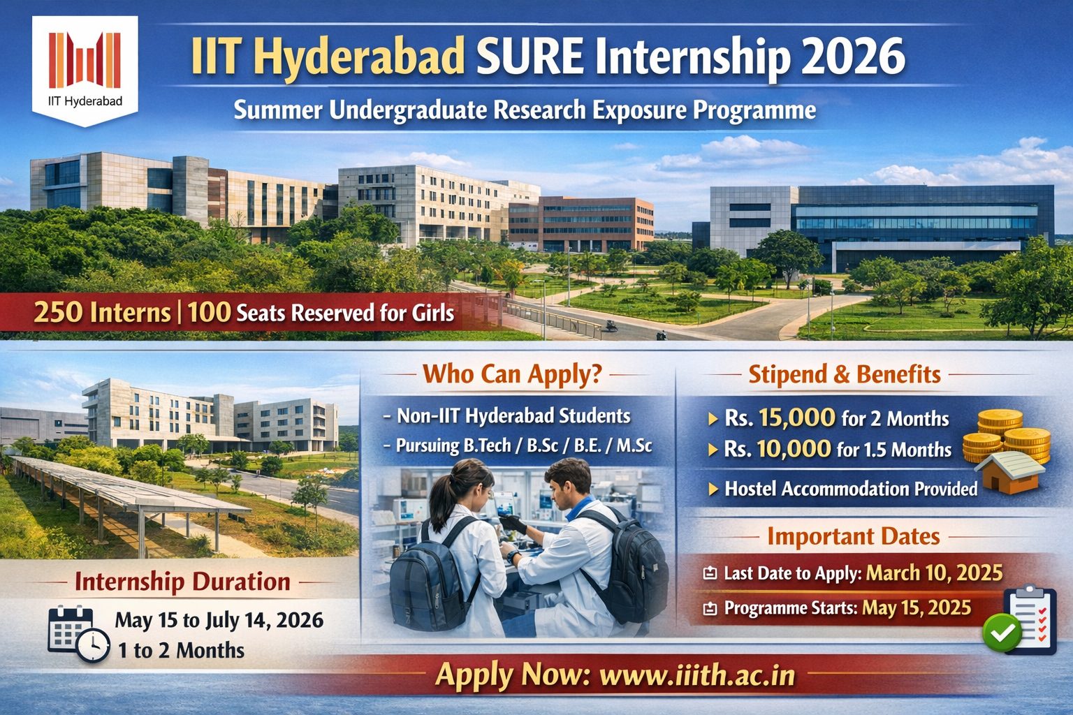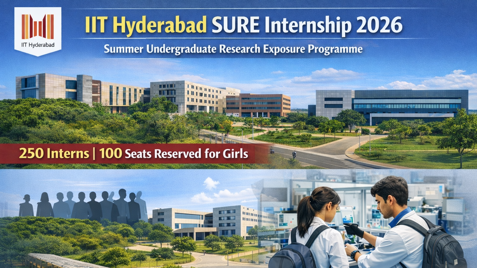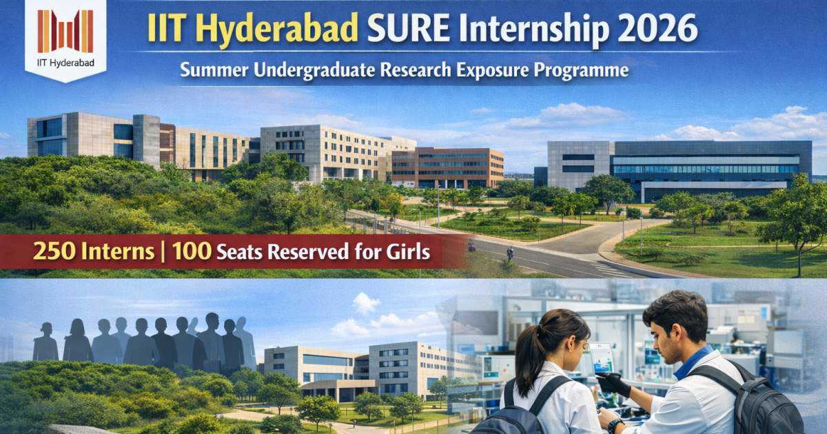 Indian Institute of Technology Hyderabad has invited applications for its Summer Undergraduate Research Exposure (SURE) 2026 internship programme. The prestigious institute will select a total of 250 interns, including 100 positions reserved exclusively for girls, offering students a chance to gain hands-on research experience.