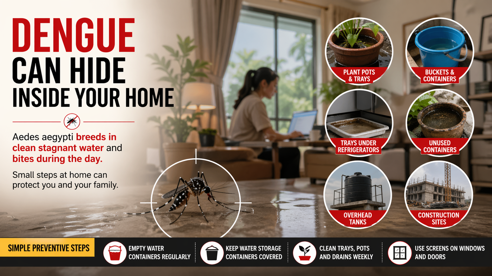 Because these mosquitoes prefer human environments and bite during the day, the risk of transmission remains high in indoor settings. People who rarely step outside may still be exposed if preventive steps are not taken
