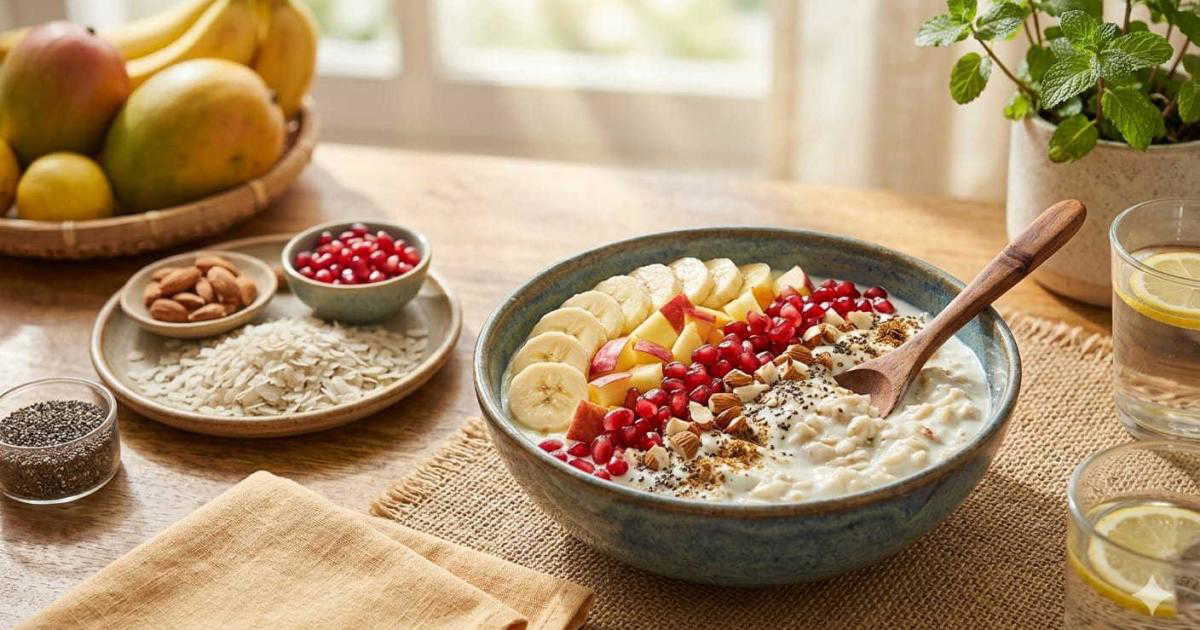 Ingredients (serves 1): 1 cup thin poha, 1 cup thick or lactose-free curd, ½ banana (sliced), ½ cup chopped apple, 2 tbsp pomegranate seeds, 1 tbsp chopped almonds, 1 tbsp chia seeds, ¼ tsp roasted cumin powder, and a pinch of salt.