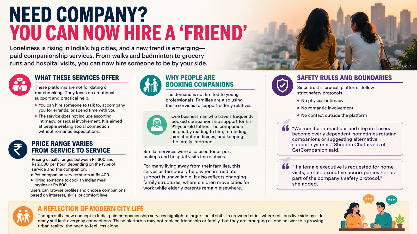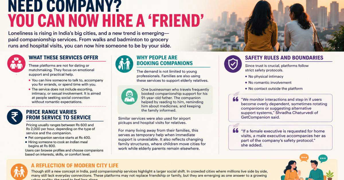 India’s big cities are often seen as places full of people, energy and opportunity. Yet for many living in these fast-moving urban spaces, loneliness has quietly become part of daily life. Long work hours, relocation for jobs, nuclear families and limited social circles have created a growing demand for companionship. In response, a new category of services is emerging in India, platforms where people can hire a companion for everyday support.
