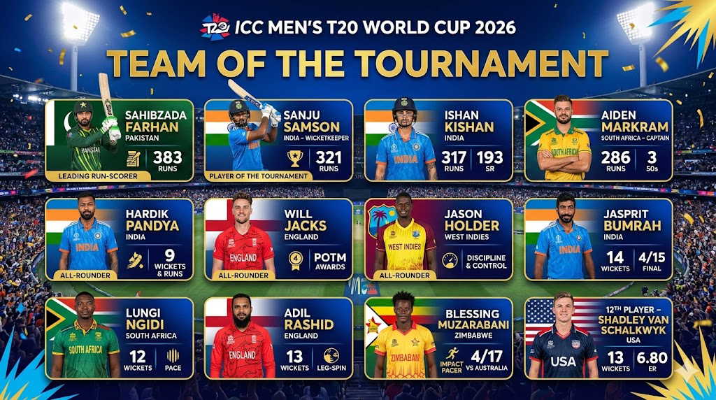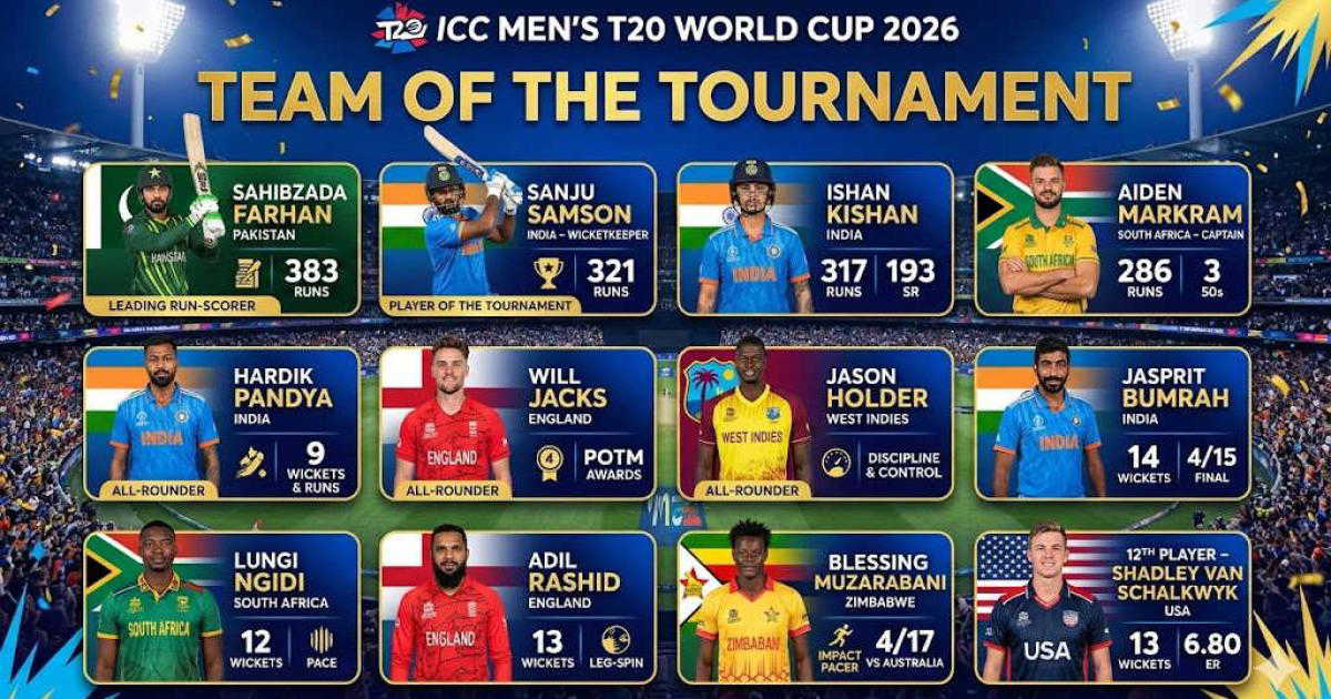 The International Cricket Council (ICC) has unveiled the Team of the Tournament for the ICC Men’s T20 World Cup 2026, recognising the standout performers who dominated the global event. The XI features players from multiple nations who delivered exceptional performances with bat and ball, playing crucial roles in their teams’ campaigns throughout the tournament.