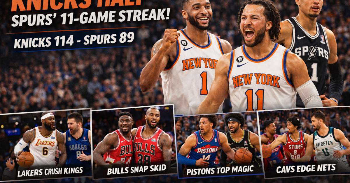 A packed NBA slate on Sunday delivered momentum-shifting results, dominant wins, and crucial performances as teams intensified their push toward the business end of the season. The headline act came in New York, where the Knicks halted San Antonio’s remarkable surge in commanding fashion. The New York Knicks secured a statement 114-89 victory over the San Antonio Spurs at Madison Square Garden, bringing an end to the Spurs’ 11-game winning streak.