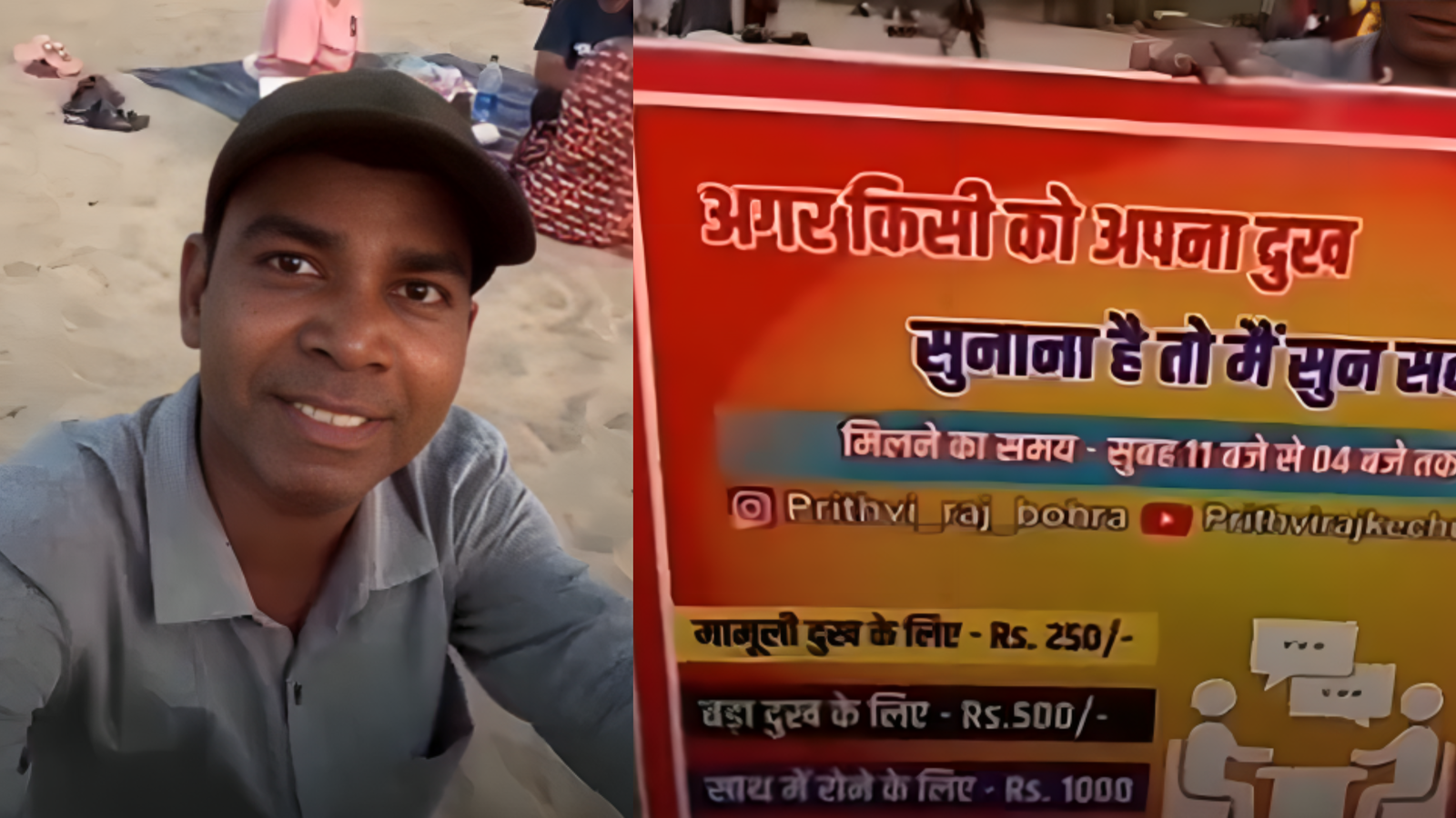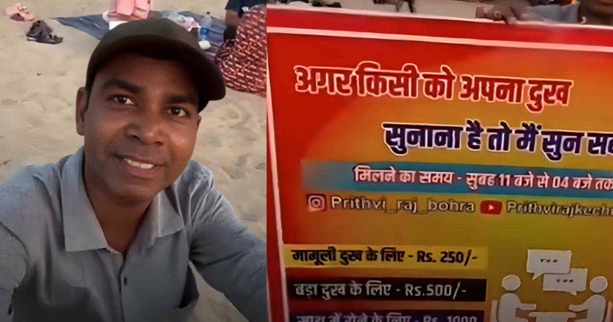 In the video, the man is seen sitting beside a placard that outlines his unusual offering. Passersby can stop and share their concerns while he listens attentively. His pricing model is clearly defined. Everyday issues are charged at ₹250, more serious concerns at ₹500, and a “cry together” session is priced at ₹1,000.