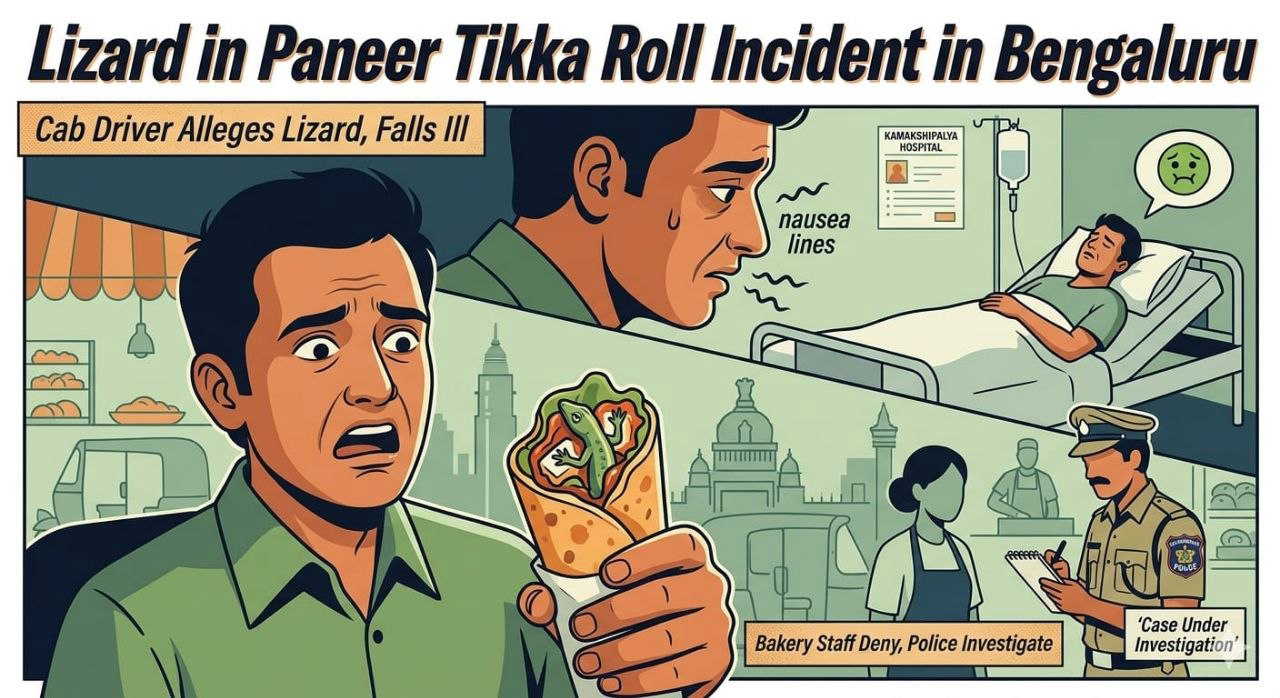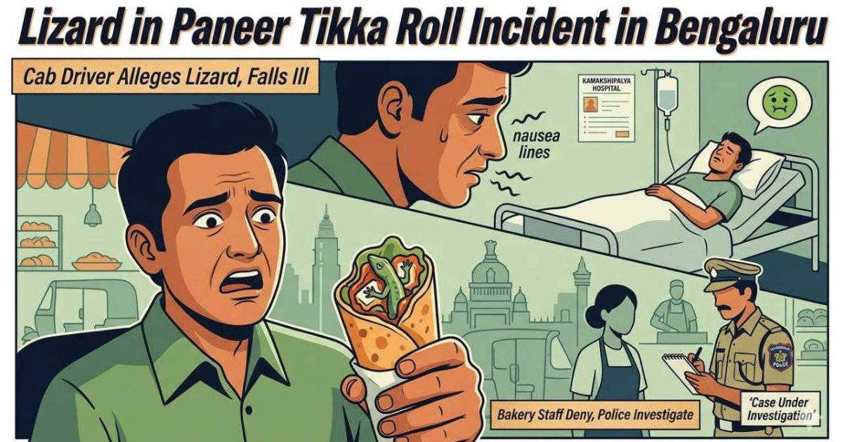 A cab driver in Bengaluru was admitted to hospital after allegedly discovering a lizard in a paneer tikka roll. The incident took place on April 25 at a bakery near Housing Board on Magadi Main Road.