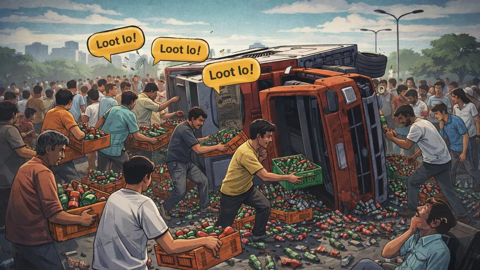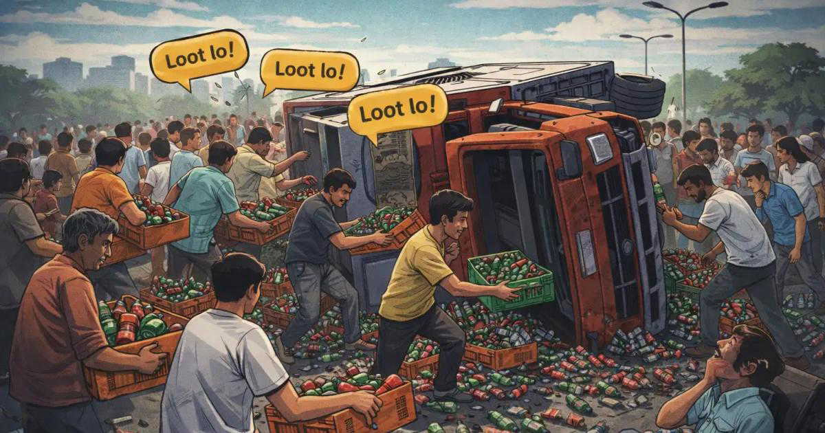A lorry overturned in Nellore, Andhra Pradesh, and people looted cold drink bottles despite the injured driver pleading with them not to.