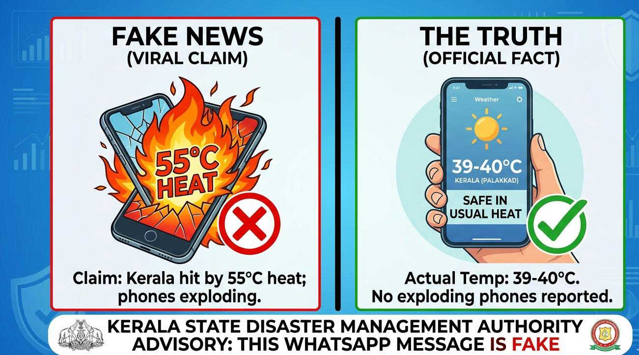 The Kerala State Disaster Management Authority (KSDMA) has clearly stated that the message is fake. It pointed out that there is no official forecast predicting temperatures as high as 54 degrees or 55 degrees anywhere in the state.