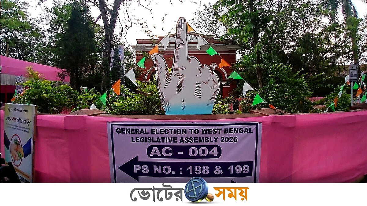 It looks like a festive venue – that's how booths 176 and 177 at Mission Girls Primary School in West Midnapore town have been decorated. An ideal polling station or model polling station has been created here. A cutout of West Midnapore district's election mascot Chitra has been placed in front of the booth.