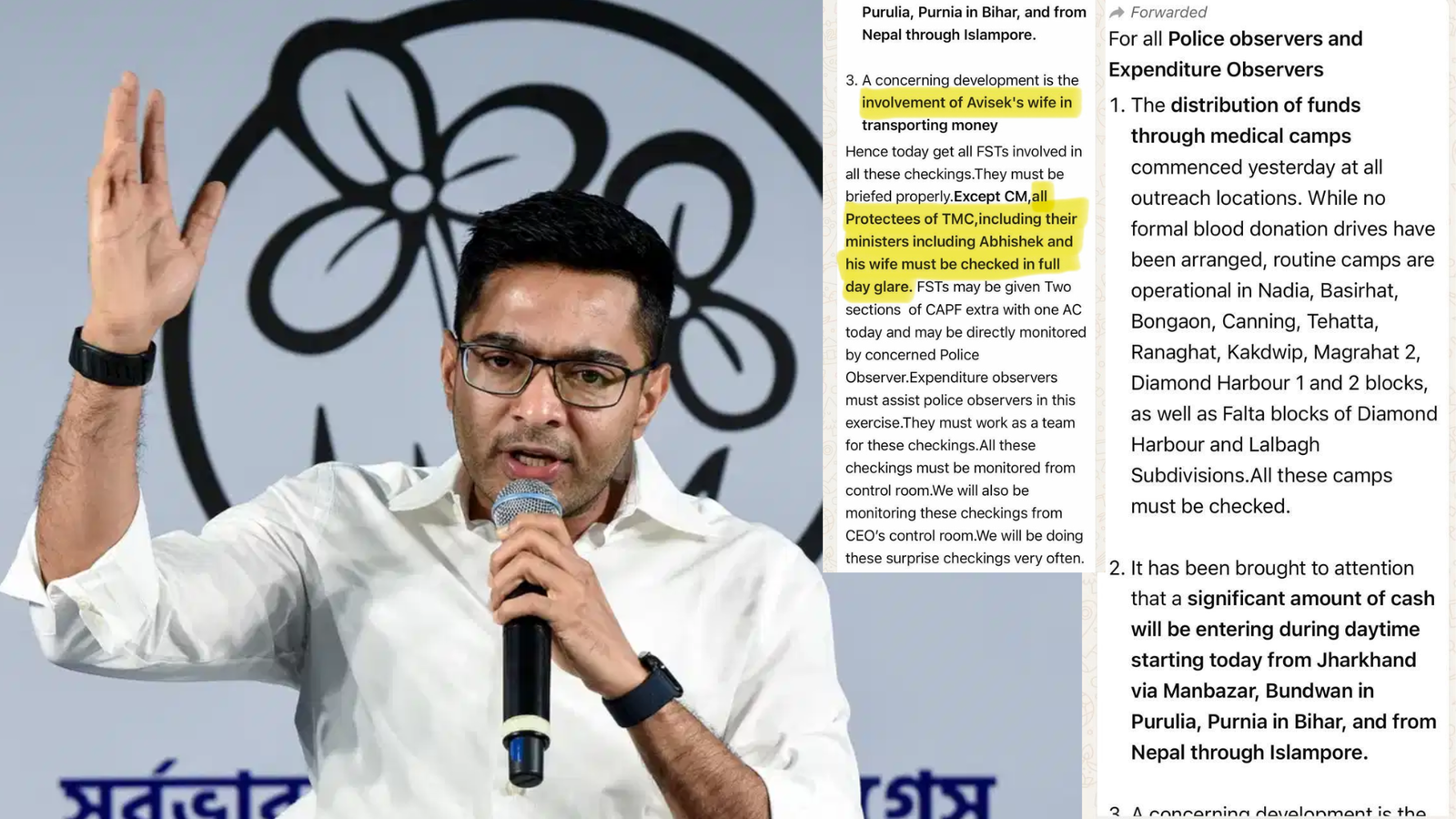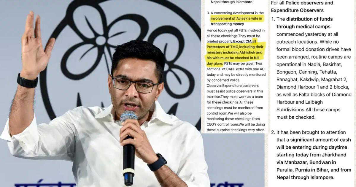 Screenshots surfaced recently appear to show directions for increased surveillance and checking. One highlighted portion mentions the "involvement of Avisek's wife in transporting money", while another line calls for checking "all Protectees of TMC, including their ministers including Abhishek and his wife must be checked in full day glare".