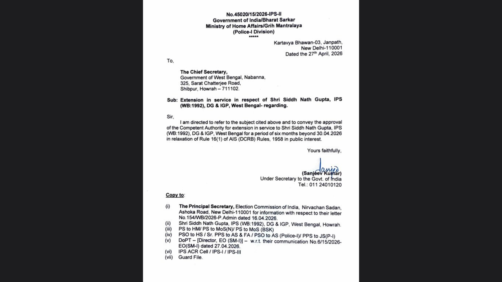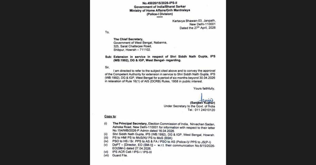 "The Appointments Committee of the Cabinet has approved the proposal of Ministry of Home Affairs for grant of extension in Service of Shri Siddh Nath Gupta, IPS (WB:1992), DG & IGP, West Bengal for a period of 6 months beyond 30.04.2026 in relaxation of Rule 16(1) of AIS (DCRB) Rules, 1958 in public interest," the order stated.