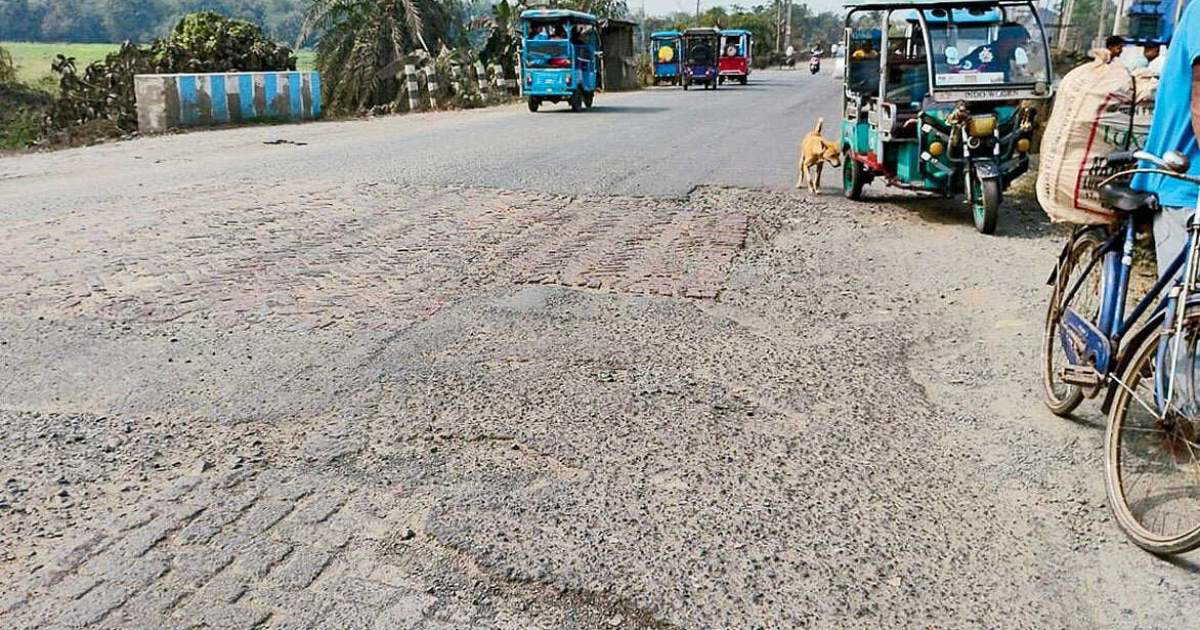 The pitch has lifted, exposing the brick ribs underneath. From large trucks and freight vehicles to ordinary people, everyone is travelling at risk through this uneven, pothole-ridden road. This is the scene of the Baidyabati-Tarakeswar road. Residents have been suffering from the miserable condition of this broken road for a long time.
