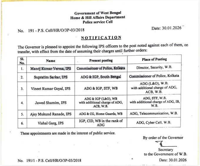 Along with the appointment of the new Police Commissioner, the state government also announced the relocation of Kolkata’s former Commissioner, Manoj Kumar Verma, along with four other senior officials.