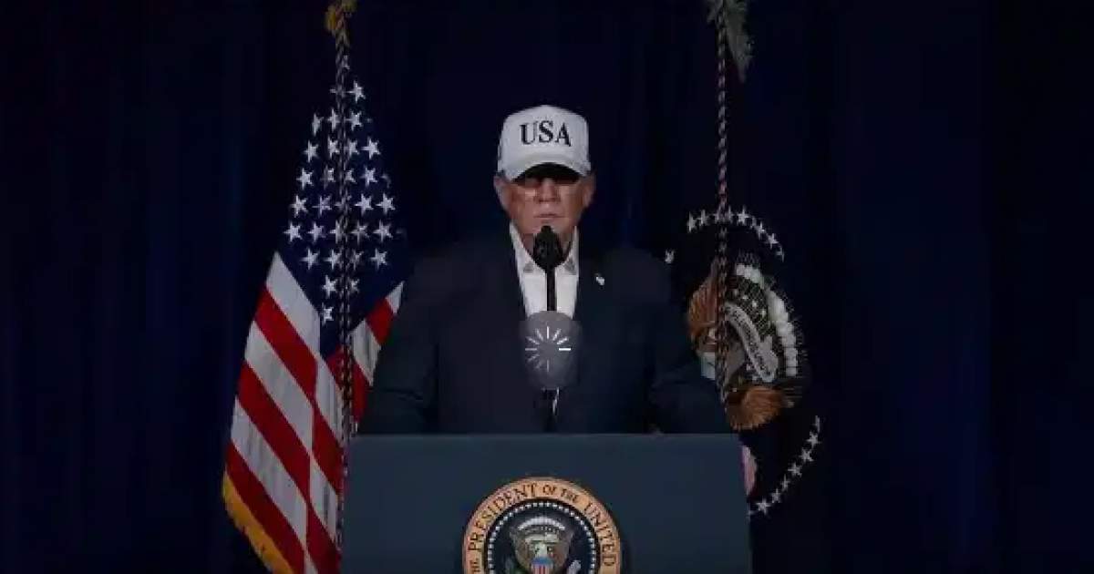 In the video, the US President wears a white baseball cap with the letters USA, a navy suit, and a white shirt without a necktie. Behind him is a dark blue curtain as he announces the war in a video from Mar-a-Lago, his home and club in Palm Beach, Florida.