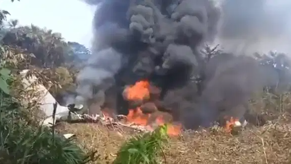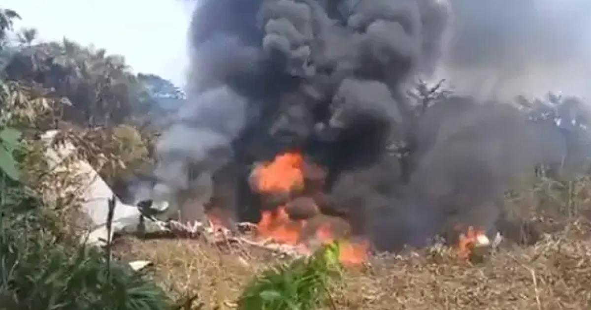 The aircraft crashed into a jungle area, leaving behind burning debris scattered across the ground. Images from the scene showed parts of the wreckage, including the aircraft's tail marked FAC 1016, surrounded by smoke and flames.