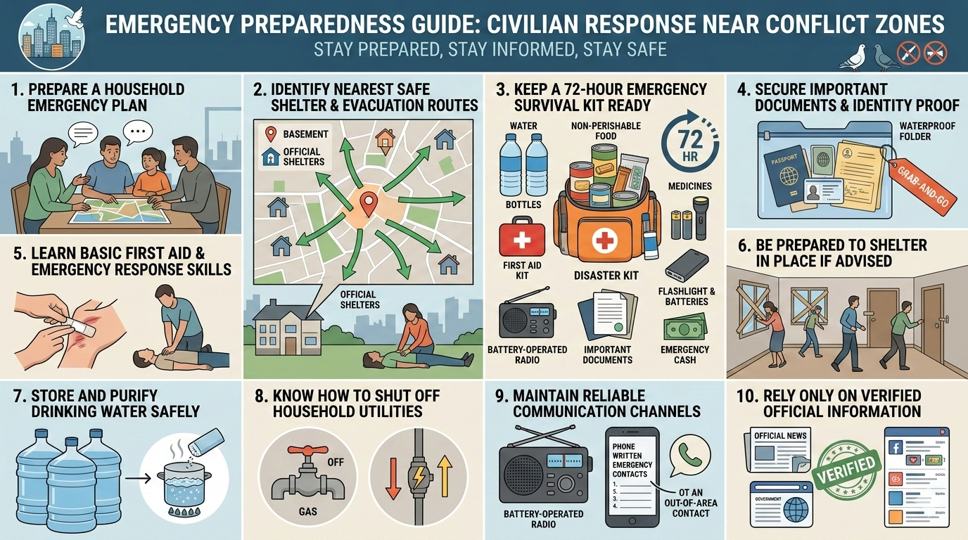 As global tensions continue to dominate headlines, the possibility of armed conflict affecting civilian areas cannot be entirely ruled out. While panic helps no one, preparation can save lives. Drawing from standard disaster-management advisories, here is a structured, practical guide on how civilians should prepare for and respond to a war-like emergency in their locality.
